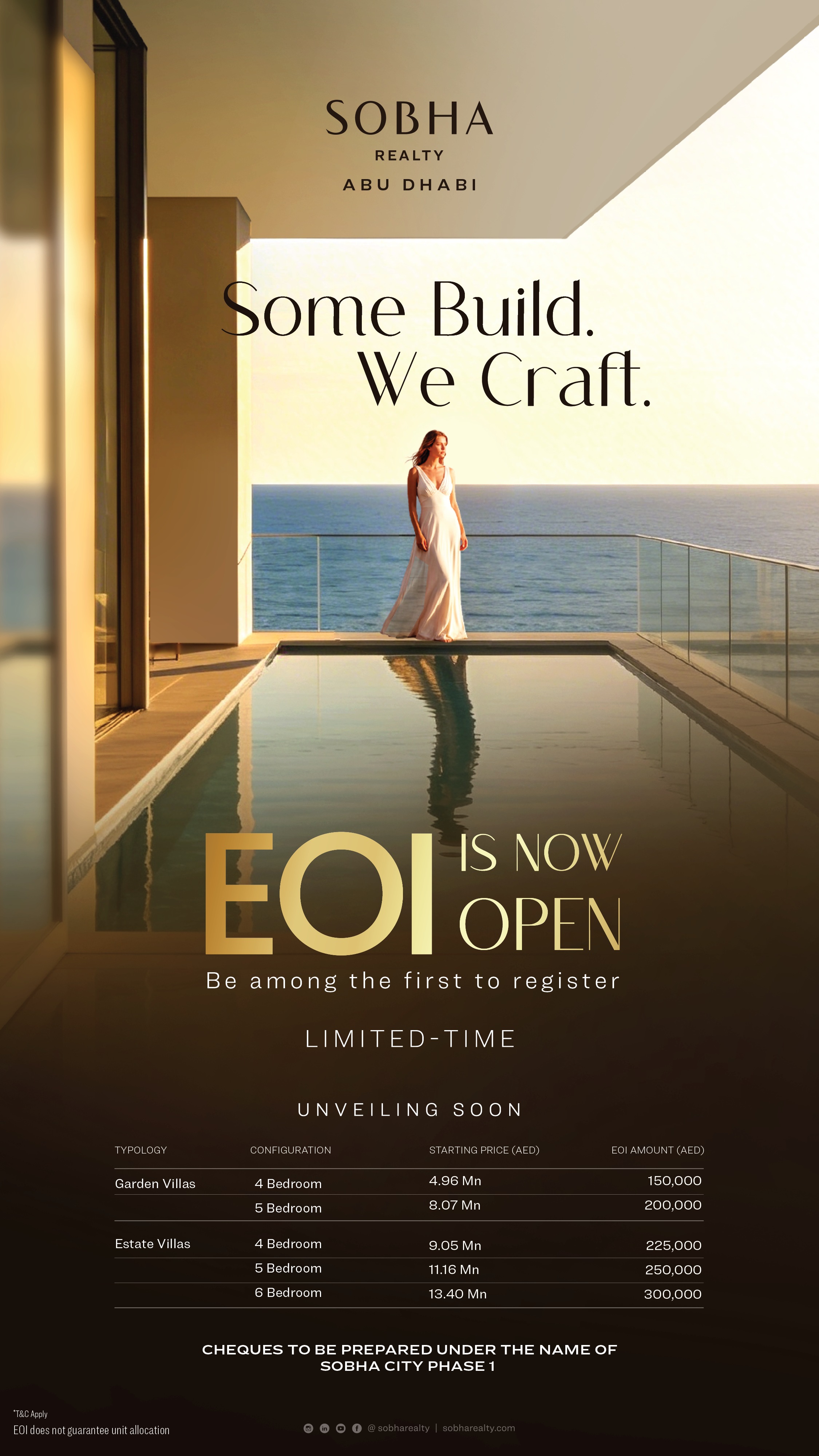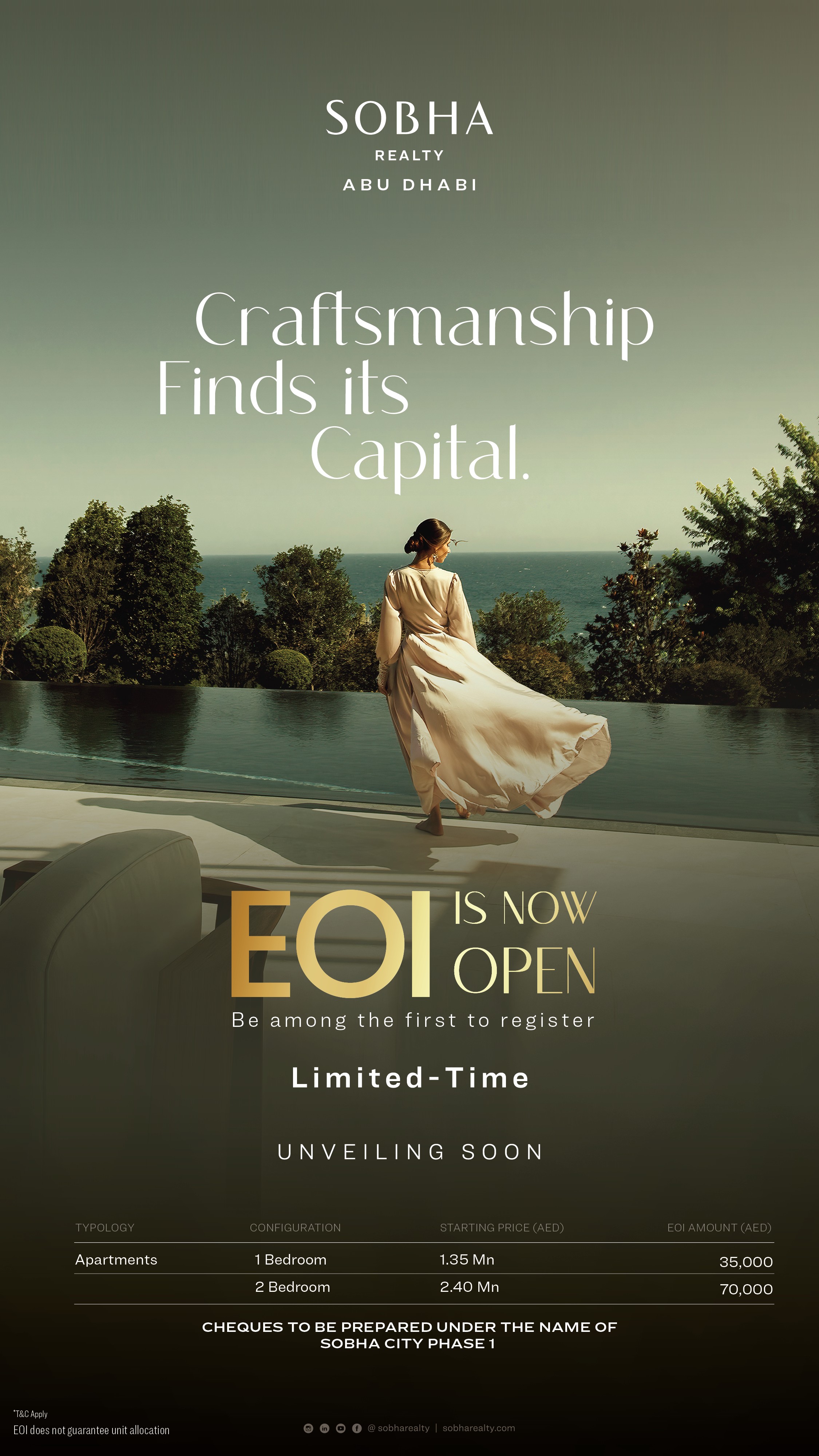 Developer Sobha nyní oficiálně oznámil spuštění předprodeje nového, zatím nepojmenovaného projektu v Abu Dhabi. Součástí budou bytové jednotky 1BR a 2BR, stejně jako exkluzivní vilová komunita s jednotkami 4 - 6BR. Developer aktuálně v rámci předprodeje sbírá EOI (nezávazná rezervace) ve výši od 35,000 AED za přednostní přístup k výběru jednotek. Více detailních informací o projektu již brzy!